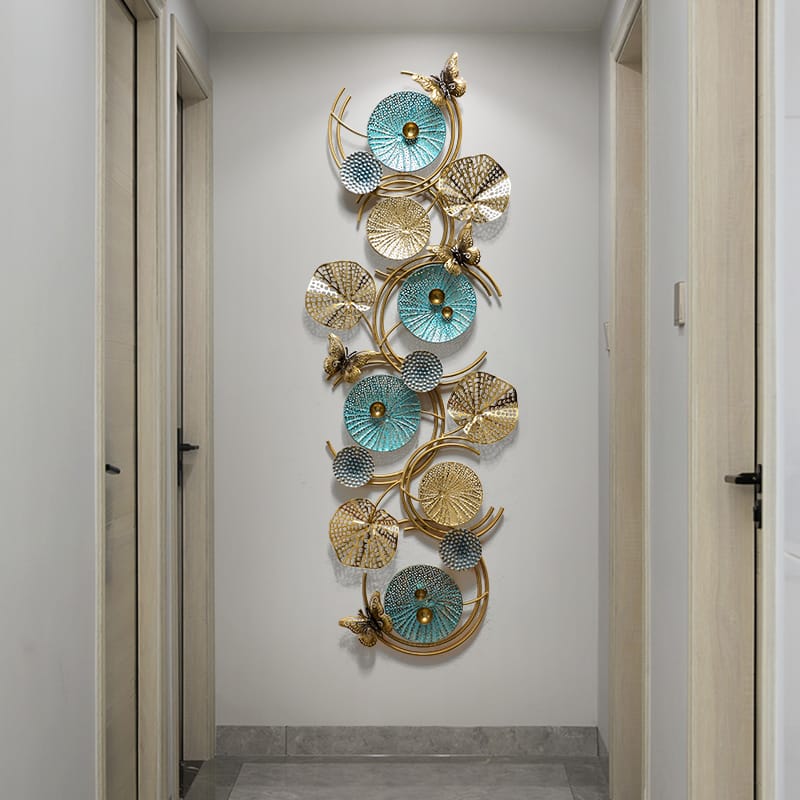 In a sunlit workshop, an artisan experiments with colors to capture quiet luxury. Gold and teal hand-painted on each plate, positioned to evoke cascading water and dreams. Delicate butterflies added mid-flight, filling pieces with playful movement. Standing apart for elegant presence and versatility, stunning vertically or horizontally. Hand-worked metal brings sophisticated yet refreshing charm. Produced in small batches, each unique. Invite this cascade home to spark conversations and brighten each day with shimmering details.