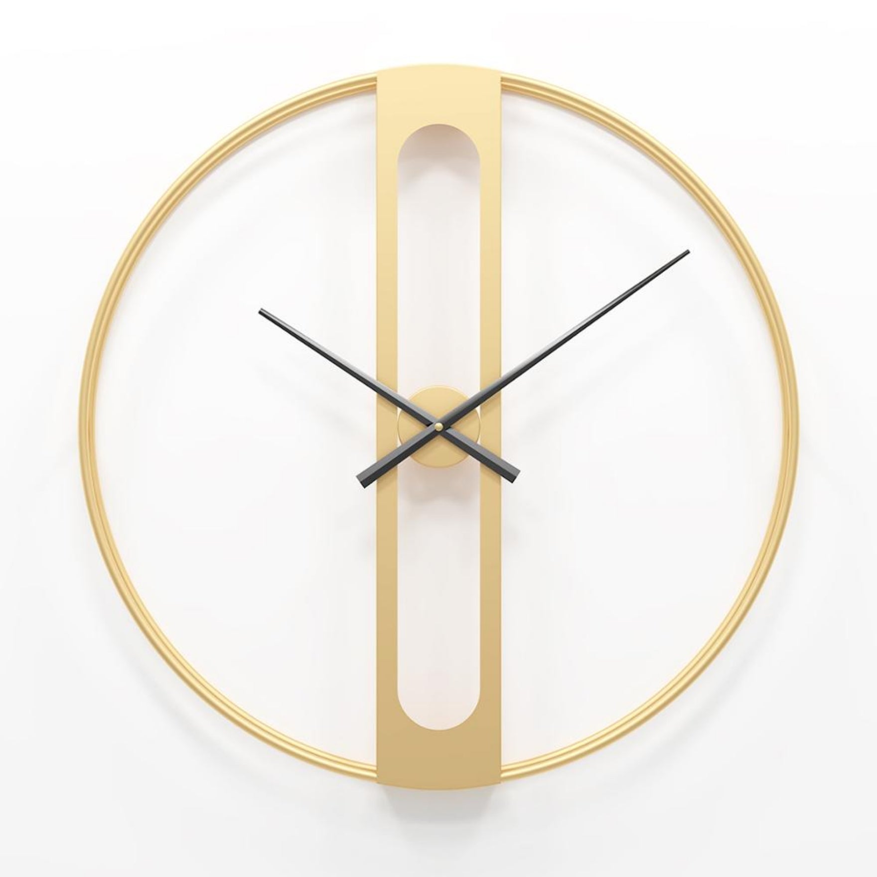 This minimalist wall clock features a clean face with sleek black hands, allowing the gold frame to shine as the focal point. Roman numerals, subtly integrated, add classical charm to modern functionality. Its sturdy construction and easy installation make it a versatile accent for offices, farmhouses, and contemporary homes alike.