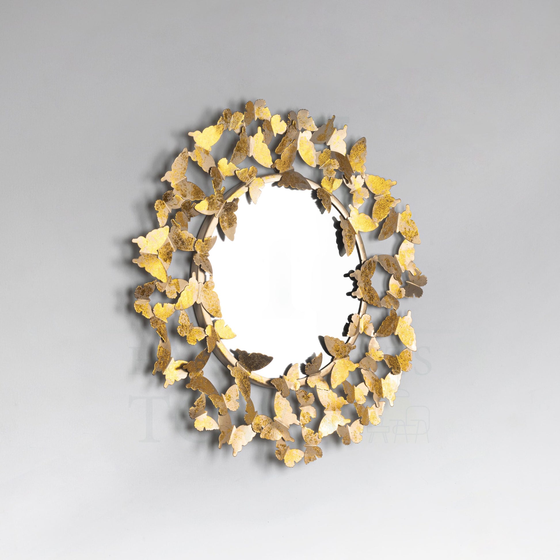 Encircling the round mirror is a colony of golden butterflies, each one individually shaped from durable metal and finished in antique gold. Their wings vary slightly in position, capturing the essence of movement and the unmistakable touch of human hands. The mirror itself offers clear reflection, while the surrounding design adds whimsy and wonder.
